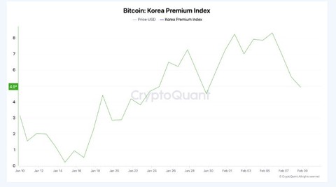 5日前の2025年2月5日、プレミアムは8.32%に達し、2024年4月中旬以来のピークを不意に破りました。2024年3月中旬に戻ると、プレミアムは10%を越え、この継続する財政バレエの一時的な頂点となりました。一方、CryptoquantのCoinbaseプレミアムインデックスは2月2日以来わずか0.013%とぎりぎりの状態で推移しており、トランスアトランティックの活動の低調さを示唆しています。