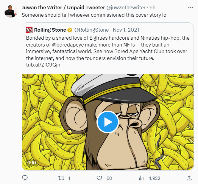 X(ツイッター)では、あるコミュニティメンバーが以前のローリング・ストーンの記事を共有し、メディアの認識がどのように変わったかを強調しようとした。その記事では、ボード・エイプ・ヨット・クラブ(BAYC)のNFTコレクションを称賛していた。