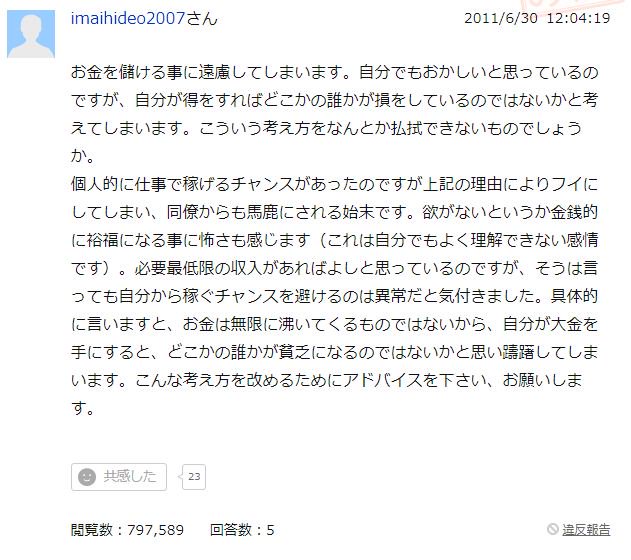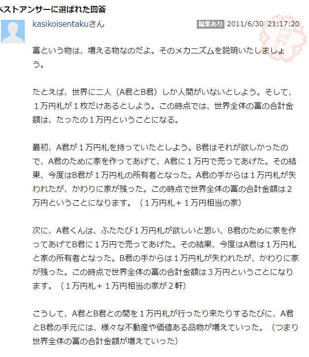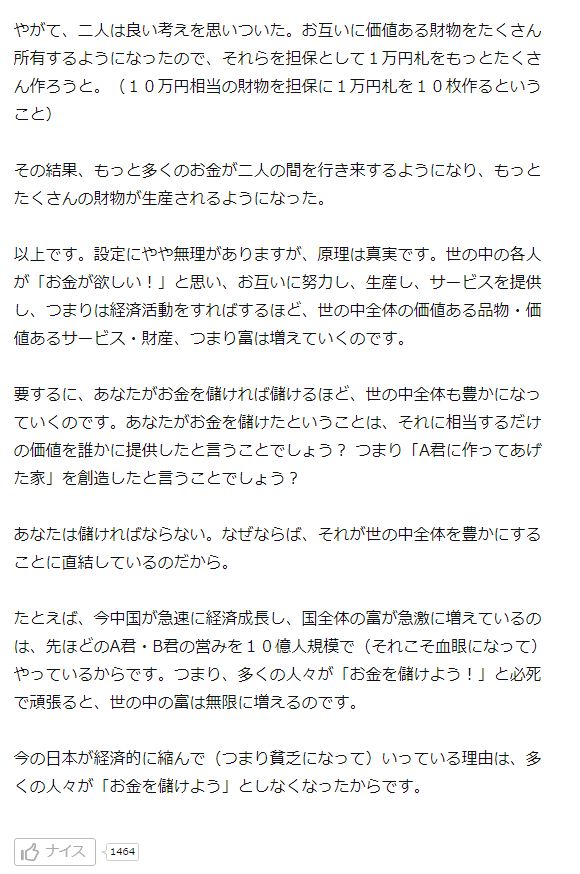 「お金を儲けることに遠慮してしまう」という疑問に対する明解かつ経済学的にも正しい、平易な説明。ヤフー知恵袋は時々こういう素晴らしい回答がある。