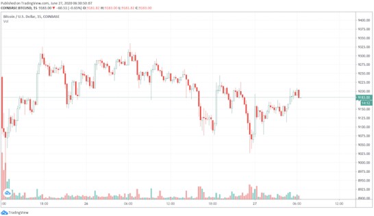 26日、ビットコインは現在9100ドル帯を推移中。