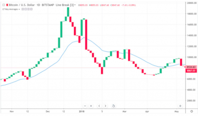 Rastani氏は、2017年末~2018年初頭にかけてのビットコインのラインブレイクチャートについて、以下のようなパターンを指摘した。