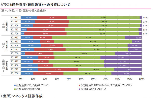 一方で、「仮想通貨を知らなかった」と回答した割合が日米と比べて高く、19年12月調査で34.1%もいることが分かっている。