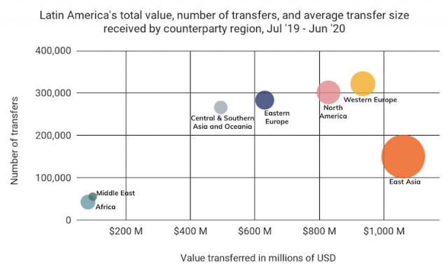 レポートによると、過去1年間にラテンアメリカは250億ドル相当(約2.7兆円)の仮想通貨を送金し、反対に240億ドル相当(約2.5兆円)を受けとったという。