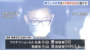 警視庁によりますと、小山容疑者らは紹介した女性が出演するAVの売り上げのおよそ半分を報酬として受け取っていたとみられます。取り調べに対し小山要容疑者は、「2006年から数万人の女性を制作会社に紹介した」と話し、容疑を認めているという。