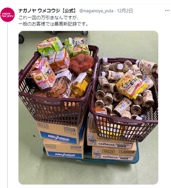 「これ一回の万引きなんですが、一般のお客様では最高新記録です」――こんなツイートとともに投稿された写真には、ぎっしりと商品が詰まった買い物篭が2つと、清涼飲料水のケースが4つ。