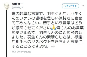 問題となったコラムで福田氏は、羽生選手が個人的に「苦手」だとして、その言動について「恥ずかしい」などの持論を展開。こうした意見に、羽生選手のファンから「ただの悪口」「大人げない」などの批判が寄せられていた。