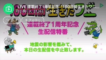 昨年ネット上でいろいろと物議を醸した「100日後に死ぬワニ」が、1周忌を記念して3月20日19時より映画情報を初公開するLINE生配信を開催しようとしたのだが、同日18時に発生した東北地方の地震を受け配信停止となった。