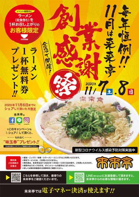 【全店】創業感謝祭イベント開催!(11/7~11/8)2020/11/06【全店】創業感謝祭イベント開催!(11/7~11/8)今年もやります創業感謝祭!いつも来来亭をご利用いただき、誠にありがとうございます。来来亭では、2020年11月7日(土)~8日(日)の2日間、全店にて創業感謝祭イベントを開催いたします。お客様への日頃の感謝を込めて、イベント期間中にラーメン(定食含む)を1杯お召し上がりいただくと、11月9日(月)~12月13日(日)の間、全国の来来亭でご使用いただける「ラーメン1杯無料券」をプレゼントさせていただきます。※現在、来来亭では「新型コロナウイルスの感染予防対策」を実施しております。当面の間、お客様にはご不便をお掛けすることもございますが、お客様とスタッフの安全の為、ご理解とご協力を賜りますようお願い申し上げます。(新型コロナウイルスの感染予防対策と取り組みについて)イベント詳細について【イベント開催日】・2020年11月7日(土)と11月8日(日)の2日間【無料券の使用について】・使用期間:2020年11月9日(月)~12月13日(日)・対象店:来来亭全店【無料券ご使用時の注意】・醤油、こってり、味噌、小ラーメン、小こってりにご利用いただけます。・限定ラーメンには、ご利用いただけません。・期間中はスタンプの付与、ポイントシールの配布はございません。・詳しくは、無料券裏面の注意事項をご確認ください。ご不明な点などがございましたら、スタッフまでお気軽にお尋ね下さい。※全国の来来亭の店舗検索はコチラ