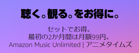 Amazonにて豊富な音楽を楽しめるMusicUnlimitedと旧作、名作を定額で楽しめるアニメプラスがセットで2ヶ月99円です。