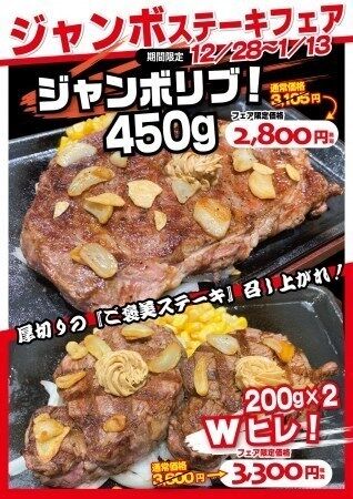 ペッパーフードサービスは12月28日から、「いきなり! ステーキ」で「ジャンボステーキフェア」を開催する。2020年1月13日までの期間限定。「ジャンボステーキフェア」は「初切りの『ご褒美ステーキ』召し上がれ!」をキャッチコピーとし、