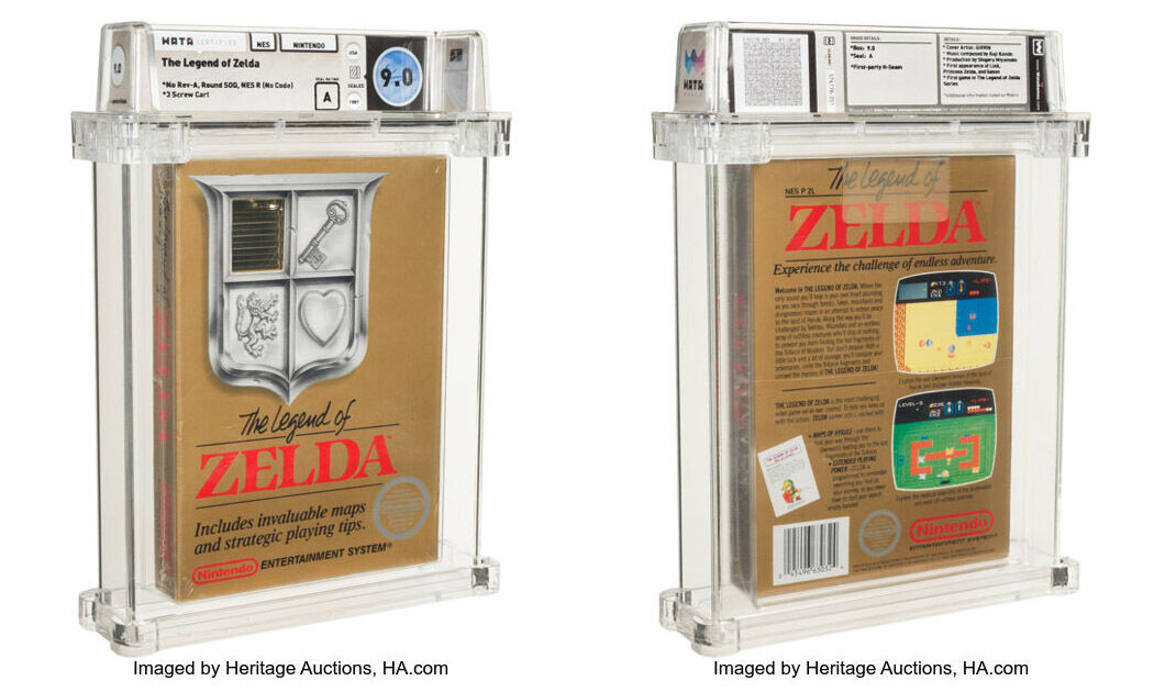 アメリカのオークションハウスHeritage Auctionsは現地時間7月9日、NES(海外版ファミコン)向けの未開封の『The Legend of Zelda(ゼルダの伝説)』が、87万ドル(約9600万円)で落札されたと発表した。ビデオゲームの落札価格としては過去最高とのこと。今回出品されたのは、1987年にアメリカで発売されたNES向け『ゼルダの伝説』だ。1億円に迫る超高額落札となった背景には、状態の良い未開封品であるというだけでなく、非常にレアなバージョンだったことがあるという。同じソフトであっても、製造時期などによりパッケージングに細かな変更が加えられることがあり、いくつか生まれるバリエーションのなかには希少性が高いと評価されるものも出てくる。今回の場合は、1987年後半のわずか数か月間だけ製造されたバージョンで、未開封品としては、コレクター向けゲーム評価・認証サービスWataGamesにわずか2本しか登録されていないものだそうだ。その内の1本が出品された。パッケージ表面下部に「Nintendo ENTERTAINMENT SYSTEM®」と「®」表記での記載があり、さらにその右側に「REV-A」という表記が存在しないことが見分けるポイントとのこと。翌年1988年前半に、REV-A表記のあるバージョンに置き換わる。そのような非常に貴重なソフトが出品され、最終的に87万ドル(約9600万円)で落札。ビデオゲームのオークション落札価格記録を更新することとなった。ちなみに、それまでの最高記録は66万ドル(約7300万円)だった。それは今年4月に出品されたNES版『スーパーマリオブラザーズ』で、やはり希少なバージョンの未開封品だったそうだが、今回およそ2000万円も上回る結果となった。NES版『ゼルダの伝説』としては、先述した「Nintendo ENTERTAINMENT SYSTEM®」表記になる以前は、「Nintendo ENTERTAINMENT SYSTEM™」と表記されていたそうで、それが最初期に生産されたバージョンになるという。その未開封品は、現時点ではたった1本しか存在が確認されていないといい、もしいつかオークションに出品されれば、今回を上回る大変な価格がつくことになるかもしれない。