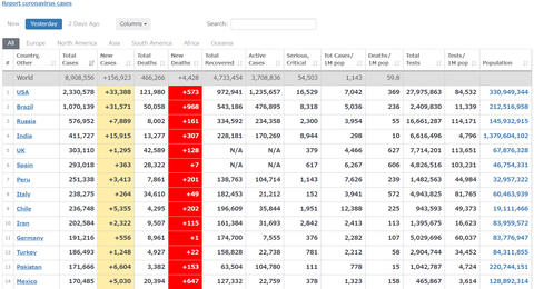 以前記事にしたことがあるが、ブラジルでは感染者の多いところに補助金が出る事から、感染者数の水増しが行われているという報道があるので、本当に5万人もの新規感染者が出たかどうかは怪しい。(ただしその日に調査が行われたわけではないので本当の可能性もある)
