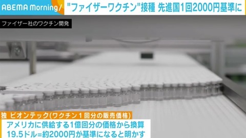 アメリカの製薬大手ファイザーが「90%以上の効果が見られた」と発表した新型コロナワクチンの販売価格について、先進国には1回分で2000円が基準となることが明らかにされた。ファイザーとともにワクチンの開発を進めるドイツのビオンテックは10日、第3四半期の決算報告を発表、ワクチン接種1回分の販売価格について、先進国に対してはアメリカに供給する1億回分の価格から換算した19・5ドル=およそ2000円が基準になると明らかにした。一方で、途上国にも供給を目指しているとして、国や地域によって価格は異なる見込みだとしている。日本は1億2000万回分の供給を受けることで合意していて、接種費用については国が全額負担する方針。(ANNニュース)2020.11.11 07:06