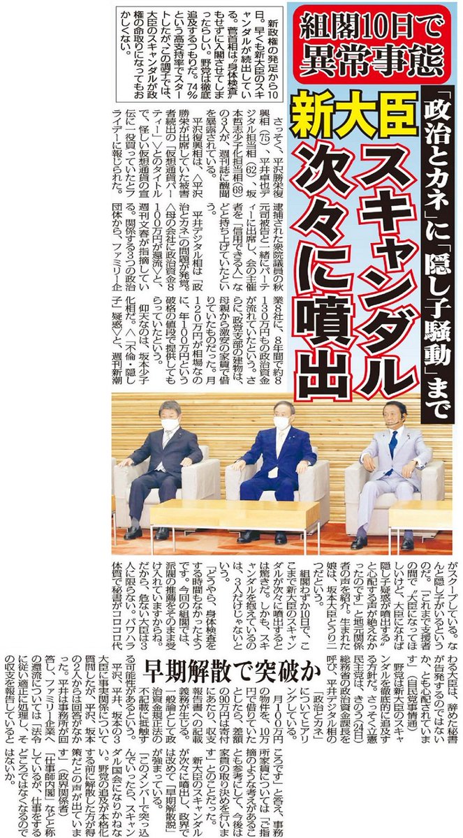 【スキャンダル解散?!】組閣から10日 身体検査できず新大臣3人にスキャンダル噴出。平井デジタル相、平沢復興相の被害続出の仮想通過パーティ。坂本少子化相の隠し子。