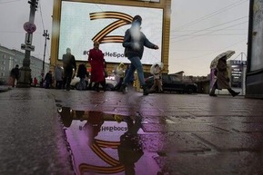 「Z」の文字は最初、ウクライナに侵攻したロシアの軍用車両に記され、その後、モスクワの車や街角、衣服、インターネット上で広く見られるようになっている。