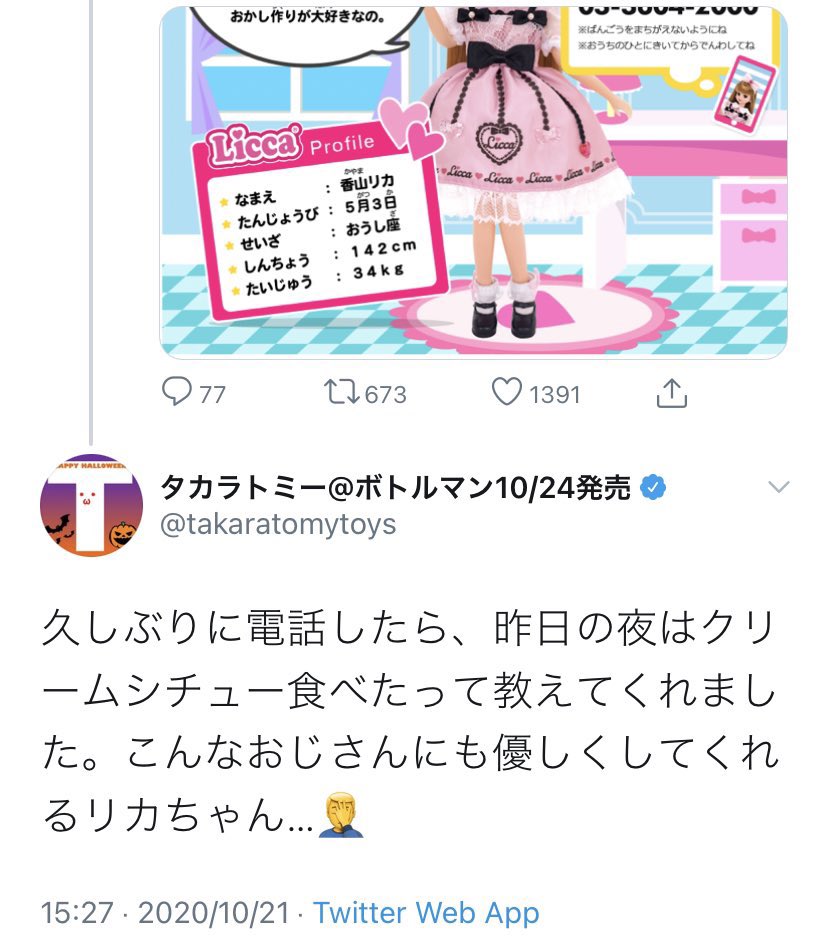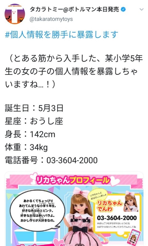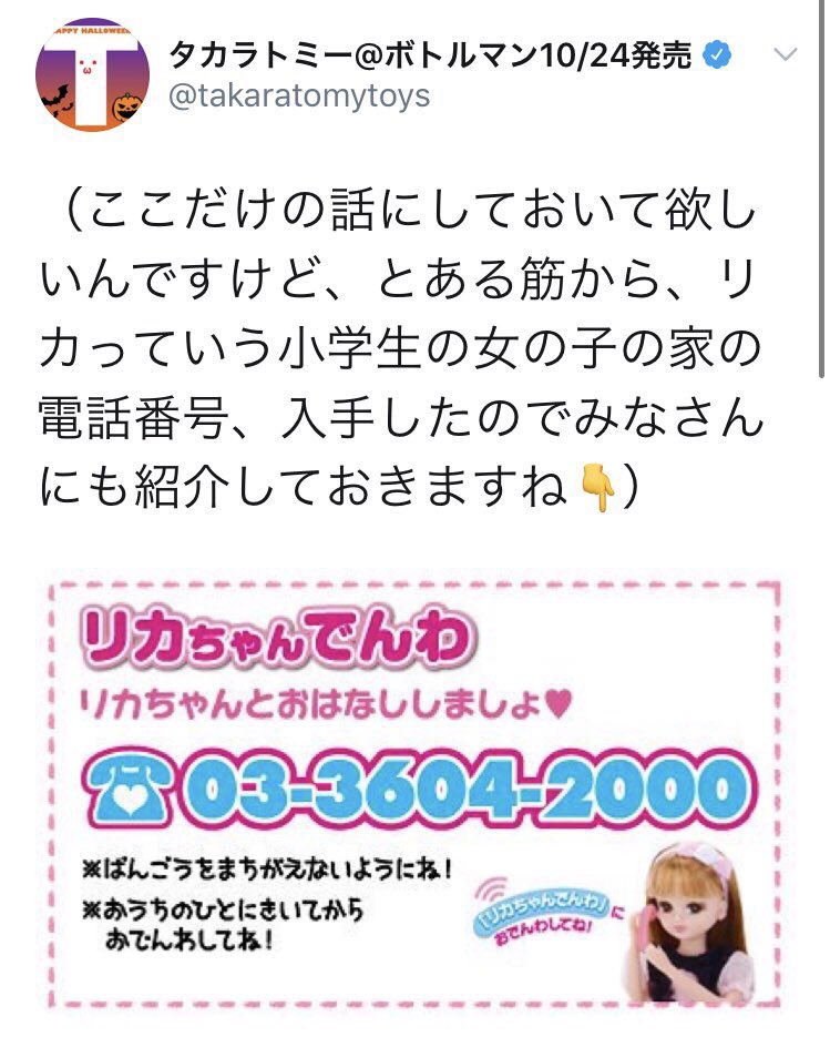 タカラトミーは、公式ツイッターアカウントの投稿で不適切な表現があったことをあらためて謝罪し、新規ツイートを当面停止するとした。同社は30日、公式ホームページを更新し、「弊社公式Twitterで10月21日に発信しました内容において不適切な表現がございました。これは同日、Twitter上で『#個人情報を勝手に暴露します』というハッシュタグがトレンド入りしていたということを関連付け、弊社商品キャラクターであるリカちゃんのプロフィールおよび『リカちゃんでんわ』の告知を行ったというものでございました」と説明。当該ツイートは同24日に削除し、謝罪していたが、「この告知表現により多くの皆様に不快な思いをさせてしまいましたこと深くお詫び申し上げます」とあらためて謝罪した。続けて、「本来であれば、皆様の『夢』の実現のために、新しい遊びの価値を創造し、それを広く知っていただくためのSNSアカウントでの情報発信が、社会の一員として守るべきモラルに欠ける内容で、多くの皆様に不快な思いをさせてしまい、企業アカウントの投稿として極めて不適切な投稿であったと深く反省しております。当社では今回の問題を、SNSアカウントの表現上の問題としてのみ捉えず、コンプライアンス遵守とモラル意識の問題としてとらえ、タカラトミー公式Twitter(@takaratomytoys)の新規ツイートを当面停止するとともに、関連するツイートに関しましても順次削除対応してまいります。さらに社員教育の改めての徹底と、運用ポリシー(コンプライアンス遵守・運営管理体制等)を全面的に見直してまいります」とした。日刊スポーツ10/30(金) 14:43