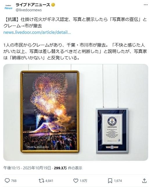 8月に「最も高い山型(形)の仕掛け花火」がギネス世界記録に認定された千葉県市川市民納涼花火大会を巡り、市が、ギネス認定証とともに花火の写真を市役所で展示したところ、1人の市民から「写真家の宣伝につながりかねない」とクレームがあり、市が写真を撤去したことがわかった。写真家は「納得がいかない」と反発。市には、「なぜ撤去したのか」と問い合わせや抗議が複数寄せられている。