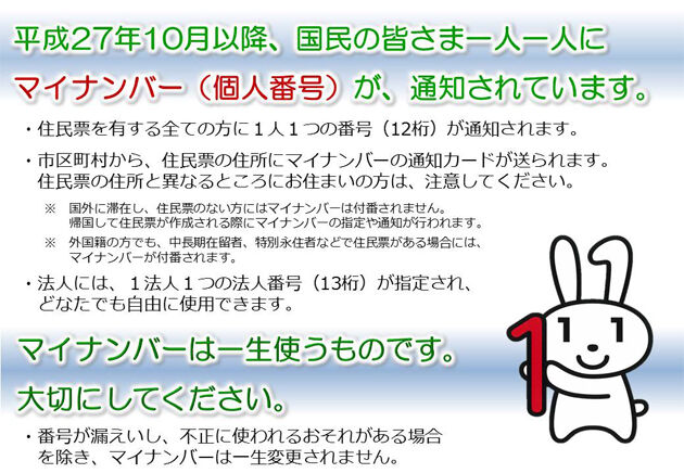 マイナンバーが漏えいして、不正に使われるおそれがある場合を除いて、番号は一生変更されませんので、ぜひ大切にしてください。