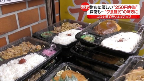 ※日テレ飲食店の時短営業で夕食に困っている人が多い中、お弁当の店が売り上げを伸ばしています。300円で総菜を詰め放題できるお弁当など、「激安弁当」を取材しました。◇時短営業により、飲食店のあかりが消えた東京・浅草の街。午後10時過ぎですがお店の前には弁当を選ぶ人がたくさんいます。お客さんでにぎわっていたのは、駅近の弁当店。年中無休の24時間営業で、主力の弁当の価格は焼肉弁当もハンバーグ弁当もおよそ20年前から据え置きで250円。この価格とボリュームでコロナ禍でも毎日400人以上のお客さんが来店。特に午後8時から10時の客が5割増しだといいます。30代「コンビニしかやってない中でコンビニじゃないものが食べられるのはなかなかない」40代「自炊しなくても手軽に食べられる」飲食店の時短営業の余波で、「夕食難民の支え」となっているのです。30代「コロナ禍の前から来ていたんですが改めてコロナ禍でいいなあと思ってます」そして、こちらも人気の弁当店。最大の特徴は――味の仕事屋・野口順子店長「バイキング方式のお弁当屋さん」60種類にも及ぶ総菜のバイキング。高野豆腐などヘルシーな総菜から、「サラミのポテサラ包み」「レバーのワイン煮」など、店独自の斬新なメニューまで。300円か500円の容器を選んで詰め放題なのです。300円を選んだ常連客は――40代「(Q:1人分ですか?)いや3人分です」目的は腹を空かせた家族3人分の夕食。1人に換算すると100円です。上手に詰められるのでしょうか?完成したのは、おかずでパンパンに膨れあがった容器が。かさばる揚げ物を入れてから、小物でスキマをうめるという戦略です。40代「通えば通うほどうまくなる。頭使って詰めれば。パズルですね本当に」しかし、詰め過ぎは禁物。味の仕事屋・野口店長「ダメか。開いちゃったね。350円です」ふたが閉まらないと追加料金です。この安さのワケは――味の仕事屋・野口店長「もうちょっとで期限が切れそうなんだけど、まだ使えるものが大量に仕入れることができる」独自の仕入れ網です。今は、コロナ禍の影響で、学校給食用や飲食店用だった食材を入荷。食品ロスの解消にも貢献したいということです。そして。次々と揚げられる魚のフライに、炊きたてごはん。こちらは平日でも400人以上が来店するという葛飾区の人気弁当店。その最大のウリは――お客さん「弁当が280円。普通は考えられない」ゆでたてパスタやシャケなど具だくさんののり弁当。ボリューミーなチキンステーキ弁当も280円均一です。おかず屋 金町店・小坂綾佑店長「自社で問屋の部門があるので(食材を)安く仕入れられるシステムがある」仲介業者がない分、極限まで値段を安くしているというこの店。コロナ禍の1年を通しても今月は、売り上げが特に好調だといいます。弁当3つを購入したお客さん「(家族)3人いるんで3人分。今コロナで(外食に)出られないし、スーパーだと値段が高い」在宅勤務中のお客さん「在宅勤務やってて昼の休憩時間が限られている。そういう時に買いに来られるのはいいですね」お客さんがコロナ禍の生活に慣れるにつれて、弁当店の需要が増しているのです。しかし、激安弁当だけでは、お店の利益はわずか。「ある戦略」を掲げています。おかず屋 金町店・小坂店長「(弁当は)広告費みたいなものです。とにかく色んな総菜が目に入るように並べている」実は、インパクトある280円弁当は広告塔の役目。見やすいところに陳列した自慢の手作り総菜を追加購入してもらうことで、利益を生み出しているといいます。おかず屋 金町店・小坂店長「弁当から入ってもらって『おいしいな』と次またハンバーグとかから揚げを買いに来ていただく」安値を貫く弁当店が、夕食難民の心のよりどころとなっています。 2/16(火) 20:59配信