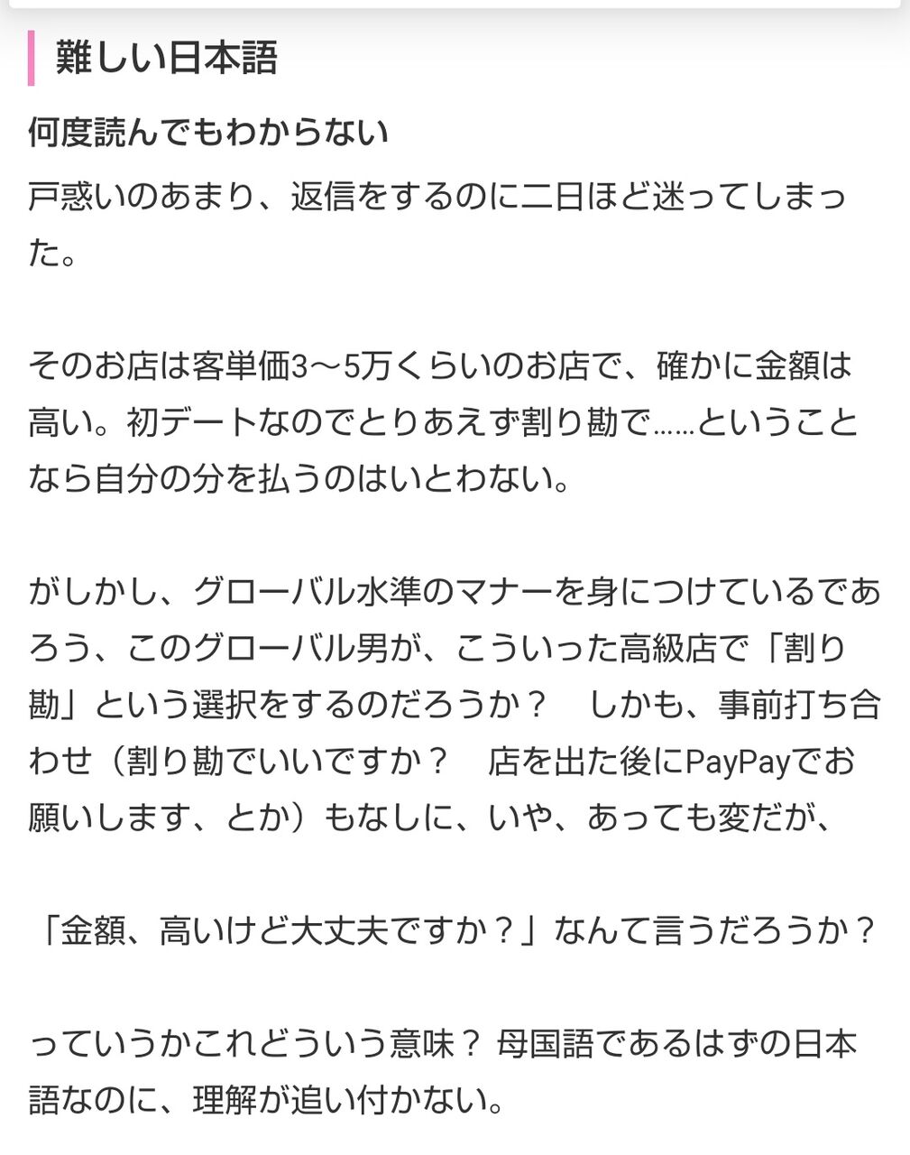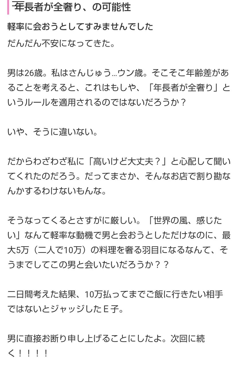 ちなみに本当に全額払わされたという女性(女性20代、男性30代で会ったという人)にもあったことがあるので、あながちネタとも言いにくい・・・。