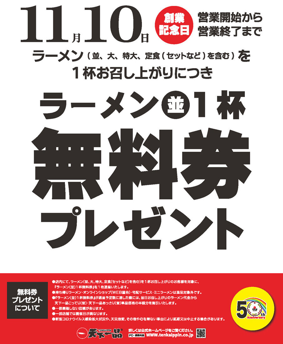 11月10日は『天下一品創業記念日』です。今年創業50周年を迎えるにあたり、お客様に感謝の気持ちを込めまして、創業記念イベントを開催することが決定致しました!店内でラーメン1杯お召し上がりにつき、ラーメン(並)1杯『無料券』をプレゼントさせていただきます!!
