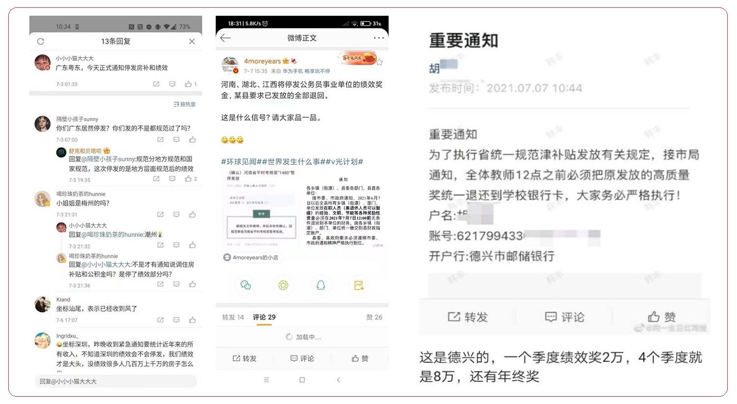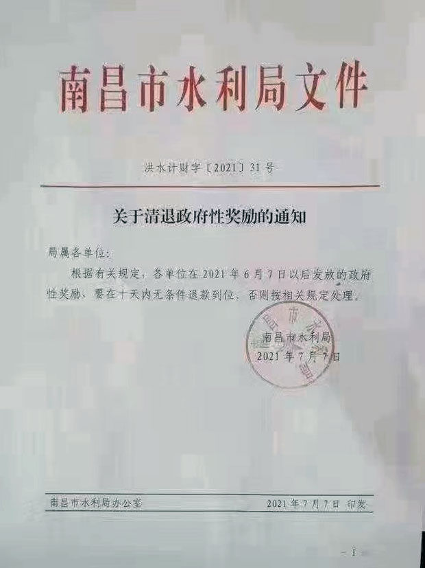 地方財政が再び苦しくなり、各地で公務員や教師に支払われたボーナスの回収が求められている画像 江西省南昌市の水資源局が職員に支給した報奨金の返還を求めています (2021/7/7)各地の公務員や教員が、支払われたボーナスの回収を求められている。中国の河南省、江西省、広東省の公務員や教師は、最近、当局から支払われたボーナスや業績インセンティブの払い戻しを受けています。第1四半期に一人当たり最大2万元(34万円)が回収され、今後はボーナスを停止することが発表されました。草の根の公務員や学校の先生たちは、「大変な時代が本当に来た」と嘆いて悲痛な叫びをあげている。中国は貧困からの脱却を宣言したばかりですが、地方政府が率先して窮屈な生活をしています。地方は教師の給料を払うには「お金が足りない」が、補助的な警察を増やすためにお金を使っています。多くの地域で教師の給料が滞納されており、地方自治体の財政難が浮き彫りになっている。政府の行政支出は、中国全土でどんどん厳しくなっています。 当局は、地方自治体に対して「より質素な生活を」と繰り返し求めている。中国共産党100周年記念式典直後の7月7日、江西省南昌市の水資源局は、関連規定に基づき、2021年6月7日以降に発行されたボーナスについて、すべての部門が10日以内に無条件の払い戻し手続きを行うべきだとする文書を発行しました。これを受けて徳興市政府は、7日にすべての教師に対し、ボーナスを一律に返すよう求めました。現在、江西省の銀行では、ボーナスを返還する余裕のない職員のために「還付ローン」を開始しました。中国の昨年上半期の財政赤字は30%も急増し、地方の債務も3兆4千億元(57兆8000億円)も急増した。関係者によると、31省・市の一般会計予算の収支は、上海市だけが黒字で、残りの30省・市は歳入が歳出をカバーできないという問題を抱えており、中でも河南省、四川省、雲南省などは、歳入と歳出の不足額が2,500億元(4兆2500億円)を超えているという。学者のリー氏は、公務員に対する様々な優遇措置が取り消されたことで、問題の深刻さが浮き彫りになったと指摘する。ラジオフリ―アジア 2021/7/12 ソース中国語 『地方财政再告急 多地公务员及教师被追讨已发奖金』