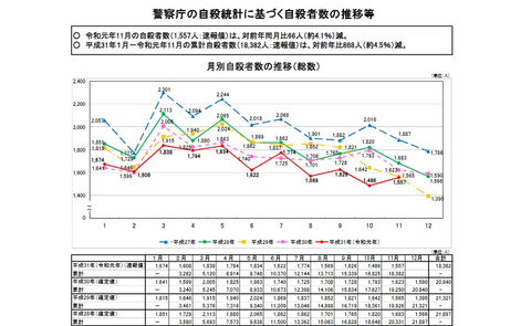 12月11日、2019年11月までの自殺者数の速報値が発表され、年間の自殺者数が2万人を割り込む可能性が高いことが分かった。
