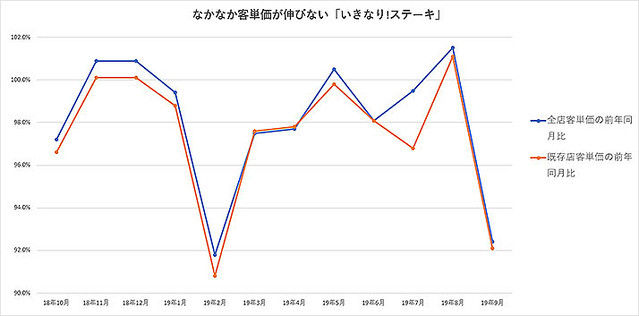 店舗数の増加と売上前年同月比が反比例する「いきなり!ステーキ」いきなり!ステーキの広報資料から昨年10月から今年9月までのデータを集め、新規店を含めた「全店の売上前年同月比」と、