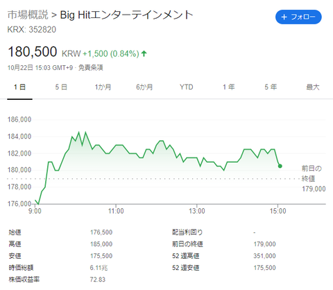 「払い戻しはできないんですか?」「株の払い戻し」という、聞き慣れないワードが韓国ツイッターのトレンドランキング1位に上がった。———-「結婚資金として貯めた5千万ウォンで投資したんですが、キャンセルできますか? まだ一日もたってないので、可能だと思いますが、実際、キャンセルしてみた方はいらっしゃいますか?」「D+2営業日以内に証券社に行けば払い戻してくれると聞きましたが、正確な規定などありますか?今後は投資を法的に禁じられてもかまいませんので、払い戻しの方法を教えてください。購買証明資料もあります」「どうして払い戻しできないんですか? 消費者保護法もありませんか?」———-これらの書き込みは、上場直後、ストップ高まで上昇した後、垂直落下しているビッグヒット・エンターテインメント(Big Hit Entertainment)株を高値で掴んでしまった初心者投資家によるもので、見ての通り、株の購入代金の払い戻しを要求しているのだ。10月15日、BTS(防弾少年団)の所属事務所ビッグヒット・エンターティンメントが韓国株式取引所に上場された。寄り付きから買い注文が殺到する中、公募価格(13万5000ウォン)の倍にあたる27万ウォンで取引開始、株価は一気に35万1000ウォンまで高騰、時価総額は11兆8800億ウォン(約1兆1000億円)に達した。これは韓国の3大エンターテインメント会社であるJYP、YG、SMの時価総額を合わせた約2兆8000億ウォンの4倍近い驚異的な額だった。公募株請約の時点から、メディアや証券アナリストの関心を集めてきたビッグヒット株には、折りしも「BTSのビルボードチャート占領」という快挙が重なり、58兆ウォンという、韓国証券市場で史上2番目に高い請約金が殺到した。また、BTSのビルボード1位を契機に、与党議員を中心にBTSメンバーの「兵役免除」が公式に取り上げられ、世論も肯定的に反応した。年末から来年までJINが軍に入隊しなければならないことがビッグヒットとしては最大のリスクだっただけに、メンバーの兵役が免除されるかもしれないという期待感が、ビッグヒットの株価予測にも大きな影響を及ぼした。※以下、全文はソースで