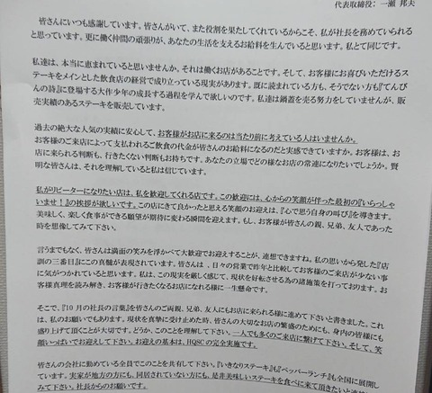 私達は、本当に恵まれていると思いませんか。それは働くお店があることです。そして、お客様にお喜びいただけるステーキをメインとした飲食店の経営で成り立っている現実があります。