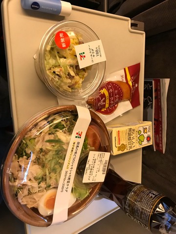 箸やフォークが写っていないのが気になります。隠したコンビニ袋に、箸とフォーク、おにぎり、パスタが入っていて、通路側の席においてはいませんか?。