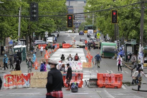 黒人男性暴行死事件を巡る抗議で、シアトルではデモ参加者と警官隊がたびたび衝突。混乱を避けるため警察が庁舎を一時的に閉鎖すると、デモ参加者は一帯を占拠し一方的に「自治区」と呼び始めた。現在は別の呼称が使われている。(共同)
