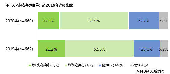 スマートフォンユーザーの69.8%が「スマホ依存」を自覚している――MMD研究所は8月19日、こんな調査結果を発表した。内訳は「やや依存している」が52.5%、「かなり依存している」が17.3%。「依存していない」(23.2%)や「分からない」(7.0%)を上回った。スマホ依存の実態については、「寝る時、スマホを枕元に置いて寝る」(60.4%)、「ちょっとした待ち時間にスマホをいじる」(59.3%)などの声があった。中には、「着信していないのに着信音や、振動を感じたりすることがある」(10.4%)、「対面でいるのにチャットで対話する」(1.8%)など依存度が深刻な層も見られた。