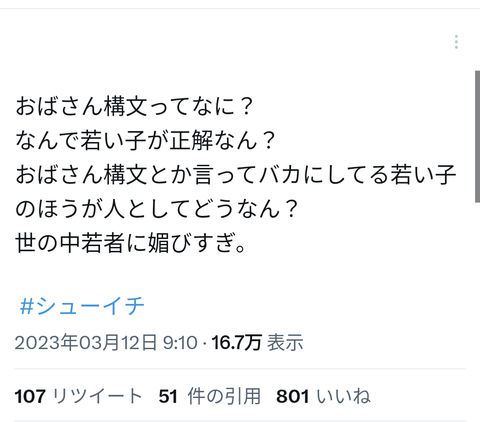 Homepageマネー総合 masakatsu7733 3年 ago Categories: マネー総合 【悲報】テレビで「おばさん構文」特集→Twitter民がキレる 1: 稼げる名無しさん 2023/03/12(日) 09:42:52.85 ID:Q1h2rpuA0.net 1001: 以下名無しさんに代わりまして管理人がお伝えします 1848/01/24(?)00:00:00 ID:money_soku 「あら^~」は僕もよく使うお! うーん、お嬢様構文・・・。 続きを読む Source: 稼げるまとめ速報 【画像】菊地姫奈「もうこれ以上お胸大きくならないで…」 » « 【子育て支援】 結婚したら奨学金を半額免除、出産したら全額免除!という案 masakatsu7733: Related Post PR広告:あなたもお釣り投資を始めませんか? ■ 利用開始3か月間は月額利用…