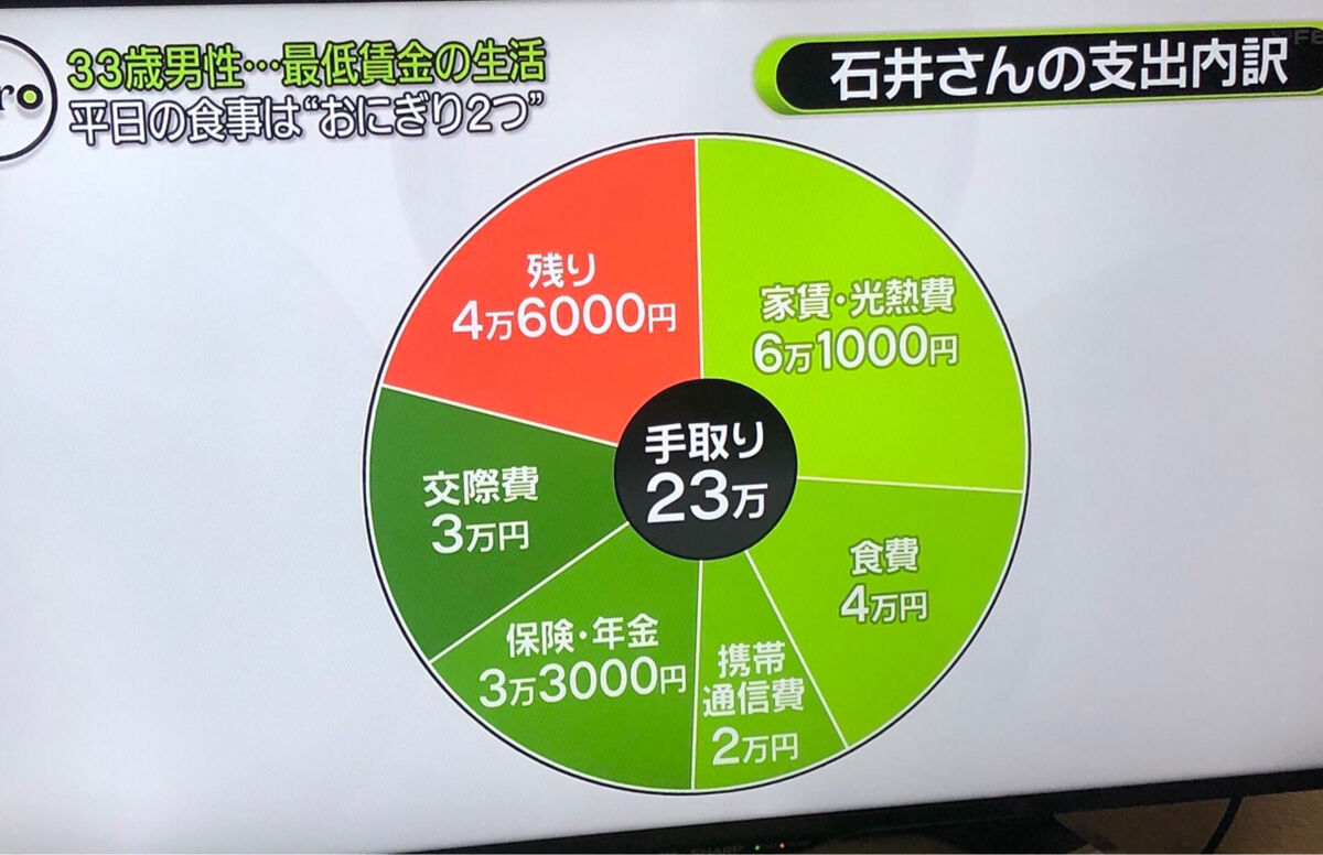 【悲報】テレビ局「33歳男性手取り23万円最低賃金生活者の支出内訳」