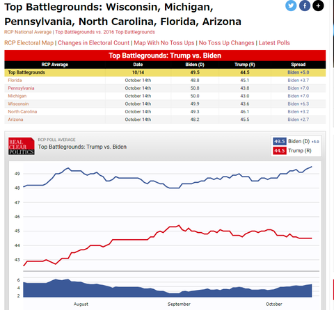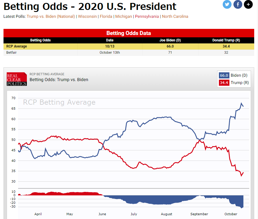 【 2020米大統領選挙、猿でもわかる解説 】トランプは前回勝った以下の州(+141)で+106取る必要があるバイデンは+37取れば勝ち06 アイオア(B+1.2) ←人口9割が白人10 ウィスコンシン(B+6.3) ←民主党の地盤11 アリゾナ(B+2.7) ←故マケイン上院議員の地元15 ノースカロライナ(B+1.9) ←共和党の地盤16 ジョージア(T+0.4) ←黒人が多く、キング牧師の地元16 ミシガン(B+7.0) ←民主党の地盤18 オハイオ(B+0.6) ←過去29/31回、ここを獲った候補者が大統領20 ペンシルベニア(B+7.3) ←バイデンの地元29 フロリダ(B+3.5) ←いつも激戦州B=バイデン T=トランプ情勢(10/14)オッズ(10/13)