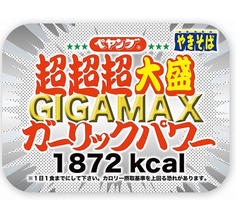 なお、以前発売した「ペヤング ソースやきそば 超超超大盛GIGAMAX」(「ペヤングソースやきそば」の約4倍サイズ)は2,142kal。それに比べると今回の「ペヤング 超超超大盛GIGAMAXガーリックパワー」は、若干カロリーが抑えられている。