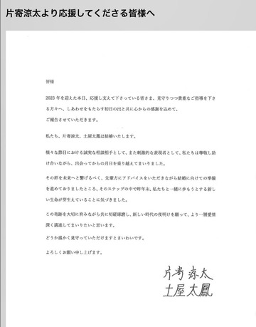 女優の土屋太鳳(27)が1日、自身のインスタグラムを更新。スポニチ本紙既報通り、「GENERATIONS」のボーカル片寄涼太(28)との結婚を発表した。片寄も公式サイトを通じて結婚を報告。2人は合わせて土屋が第1子を妊娠していることも発表した。