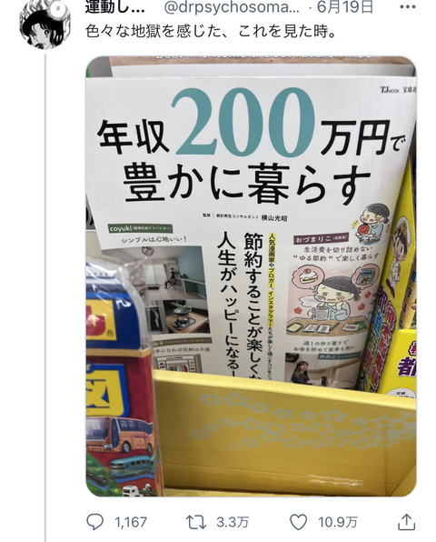 「年収200万円」という単語は、精神科医を名乗るユーザーが6月19日、書籍画像とともに「色々と地獄を感じた、これを見た時」とした投稿がきっかけとなり、話題となった。