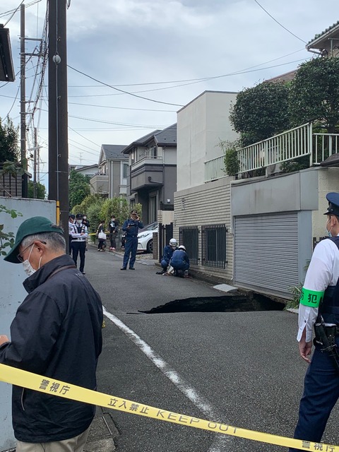現場は京王線つつじケ丘駅から約400メートルの住宅街。NEXCO東日本や警視庁によると、同日午後0時15分ごろ、道路が陥没したと通行人から110番通報があった。道路はセンターラインのない幅5メートルほどの市道で、穴は長さ約5メートル、幅約3メートル、深さ約5メートル。