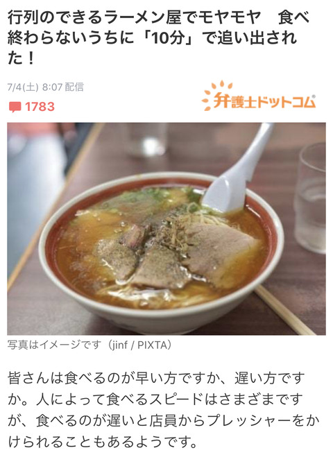 気を遣って言われたと思った相談者は「大丈夫です」と返し、その後も食べていたところ「もう次のお客さんのが出来上がってしまうので残して帰って下さい」と言われてしまいました。食べ始めて10分程度の出来事だったそうです。
