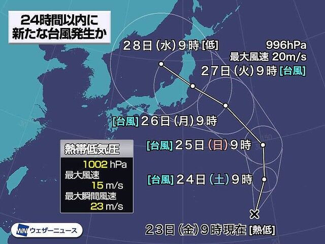 今日23日(金)9時、気象庁は南鳥島近海で熱帯低気圧を解析しました。明日24日(土)には台風となる見込みで、本州に接近するおそれがあります。