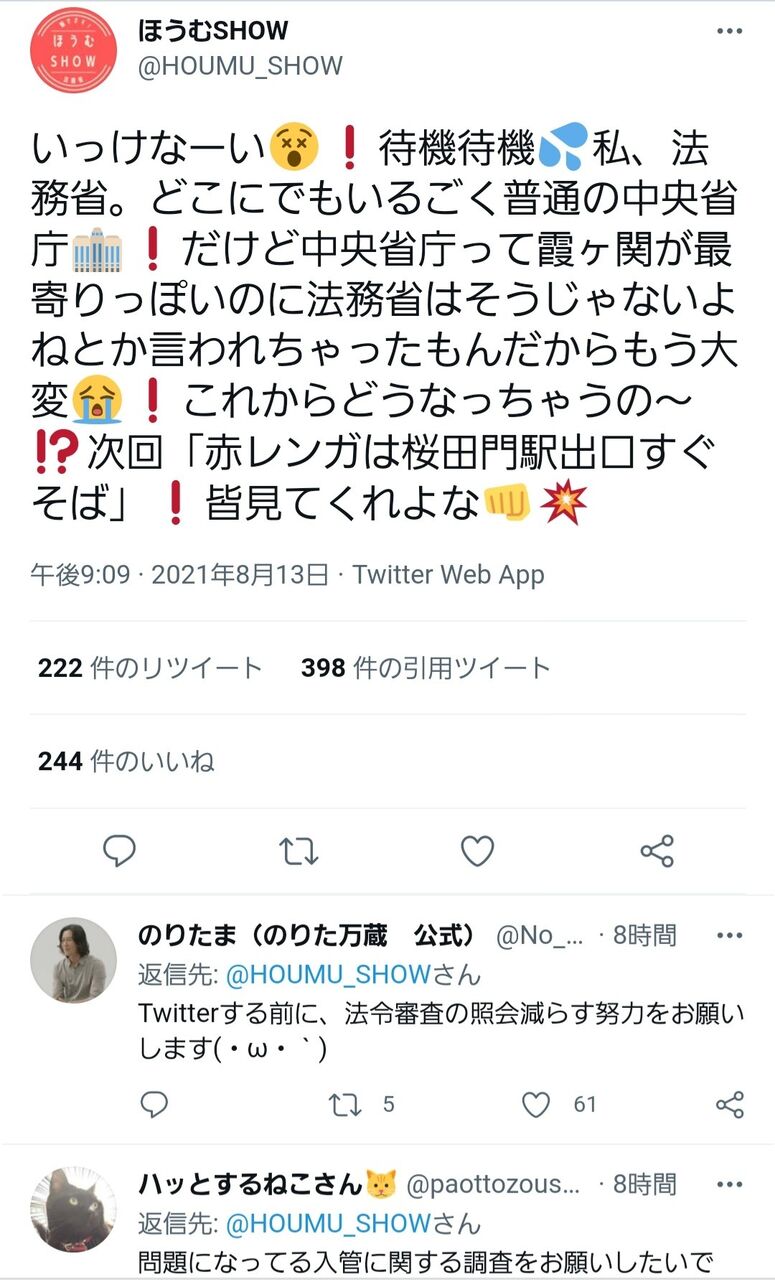 いっけなーい😵❗️待機待機💦私、法務省。どこにでもいるごく普通の中央省庁🏢❗️だけど中央省庁って霞ヶ関が最寄りっぽいのに法務省はそうじゃないよねとか言われちゃったもんだからもう大変😭❗️これからどうなっちゃうの〜⁉️次回「赤レンガは桜田門駅出口すぐそば」❗️皆見てくれよな👊💥