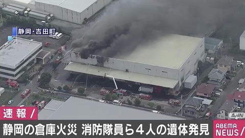 県警牧之原署と静岡市消防局によると、消火活動のため倉庫内に入った吉田消防署の30~50代の男性消防隊員3人と、県警牧之原署の地域課の男性警察官1人と連絡が取れていない。消防隊員の男性2人と女性1人もけがをしたが、いずれも命に別条はないという。