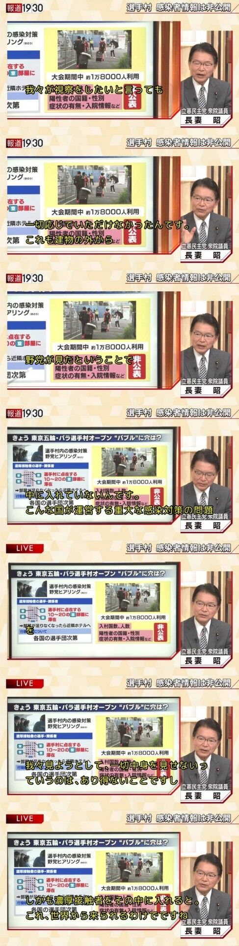 組織委は、濃厚接触者の選手や関係者は選手村の空部屋に入れ、行動制限は各国選手団次第。選手村への入村人数、陽性者の入院情報は非公開。野党の視察にも応じない。
