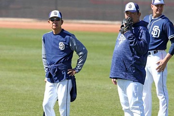 パドレスで指導する新井宏昌氏(左)と野茂英雄氏【写真:西山和明】