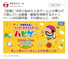 タカラトミーのTwitter公式アカウントが11月7日、10月から開始しているキャンペーンの応募件数がわずか「10件」しかない事態を嘆いていました。