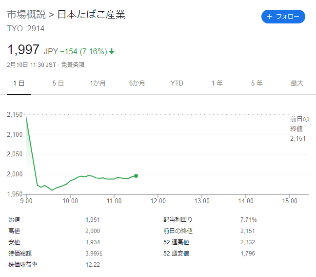 (9時15分、コード2914)JTが急落している。前日比217円(10.1%)安の1934円まで下落し、約4カ月ぶりの安値を付ける場面があった。9日、2021年12月期の連結純利益(国際会計基準)が前期比23%減の2400億円になりそうだと発表した。年間配当計画は前期比24円減の130円とし、1994年に上場して以来、初めて減配となる。業績低迷や減配を嫌気した売りが膨らんだ。