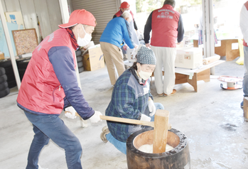 新城市社会福祉協議会所属のしんしろお助け隊(小山勝由会長・会員数14人)が20日、市内の独居老人宅などに餅を無料で配布するため、同市字東沖野の同協議会敷地内で餅つきを行い、37臼(約120キロ)の餅をつきあげた。
