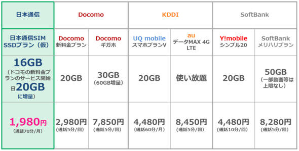 日本通信は12月4日、月間データ容量20GBに毎月70分までの通話を含め、月額1980円(税別、以下同)で提供する新料金プラン「SSDプラン」を発表した。10日から提供を始める。当初は月間データ容量16GBとなるが、NTTドコモの新プラン「ahamo」(アハモ)の提供が始まる2021年3月に同20GBへ自動的に増量する。同社は「『MVNOつぶし』ではないかといわれているドコモの新料金に対し、MVNOの代表として対抗プランを投入する」としている。ユーザー側で使用するデータ容量の上限値を設定でき、20GB(当初は16GB)以降、上限値までは1GB当たり250円で高速通信を利用できる。上限値は30GBまで1GB単位で設定できる。70分を超える通話料は30秒当たり10円。3日に発表された、NTTドコモのahamoに対抗するプラン。月間データ容量20GB、通話1回当たり5分以内のかけ放題が付いたahamoに対しては「料金が安すぎる」「MVNOが厳しくなるのでは」といった声がユーザーなどから上がっている。こうした状況を踏まえ、日本通信は「ドコモの新料金プランはまだ3カ月も待たなくてはいけないが、SSDプランは来週からすぐに使い始めることができる」と説明。「今は存在しないプランを待つ必要はなく、(ahamoより)3割以上合理的だ」としている。2020年12月04日 14時45分 公開
